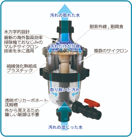■遠心力だけで水の中の汚れを分離することができる遠心分離プレフィルターです。