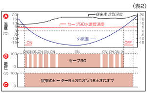 これに対しセーブ90+3は当社新開発のFTC回路(PAT.P)の働きにより外気温だけでなく風速や太陽光をも検知し1日の気温の変動が少ない真冬でも、最適な電源のオン/オフ動作を